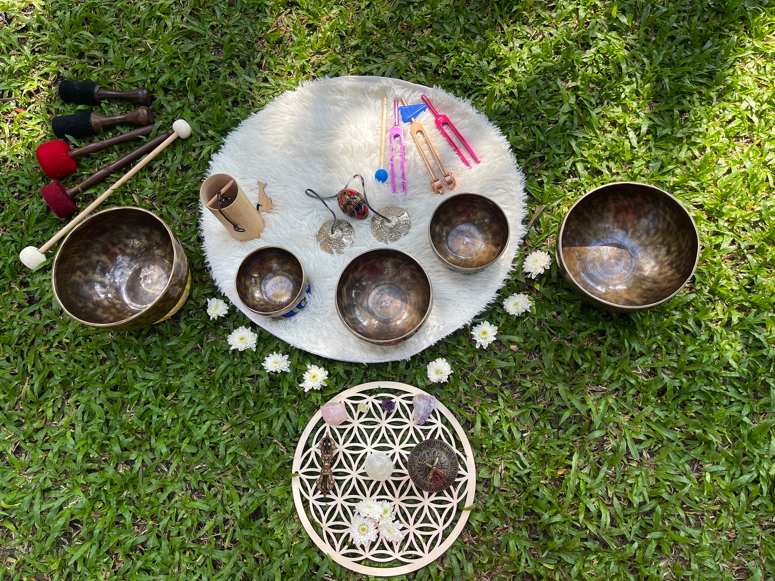 A multi-instrument sonic immersion combining Himalayan singing bowls, Koshi chimes, Kenari nuts, and intuitive sound tools—tuned to release stress and activate your parasympathetic system. You’ll emerge lighter, grounded, and reset. Perfect for beginners and anyone desiring a soothing healing session.